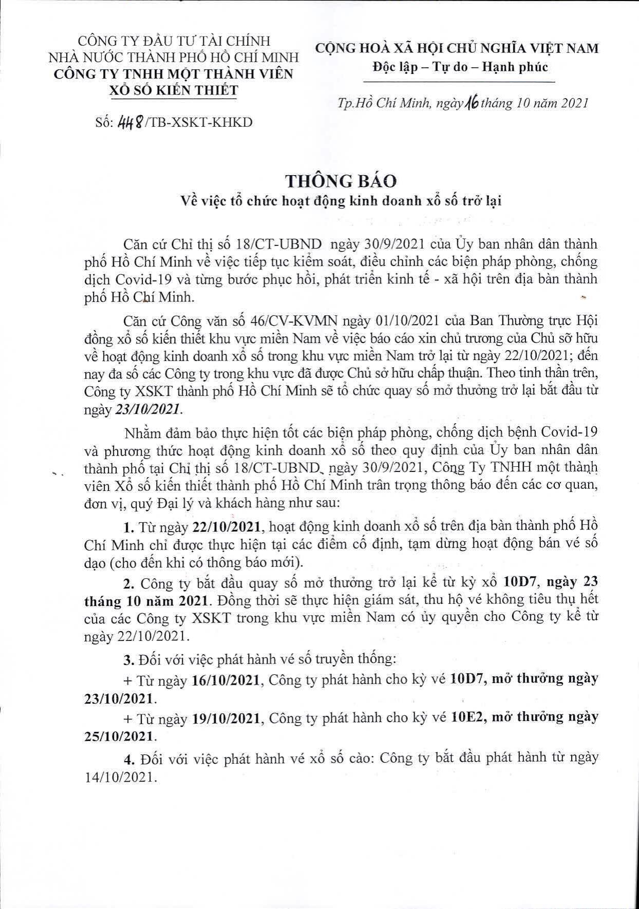 Căn cứ Công văn số 46/CV-KVMN ngày 01/10/2021 của Ban Thường trực Hội đồng xổ số kiến thiết khu vực miền Nam về việc báo cáo xin chủ trương của Chủ sỡ hữu về hoạt động kinh doanh xổ số trong khu vực miền Nam trở lại từ ngày 22/10/2021; đến nay đa số các Công ty trong khu vực đã được Chủ sỡ hữu chấp nhuận. Theo tinh thần trên, Công ty XSKT thành phố Hồ Chí Minh sẽ tổ chức quay số mở thưởng trở lại bắt đầu từ ngày 23/10/2021.