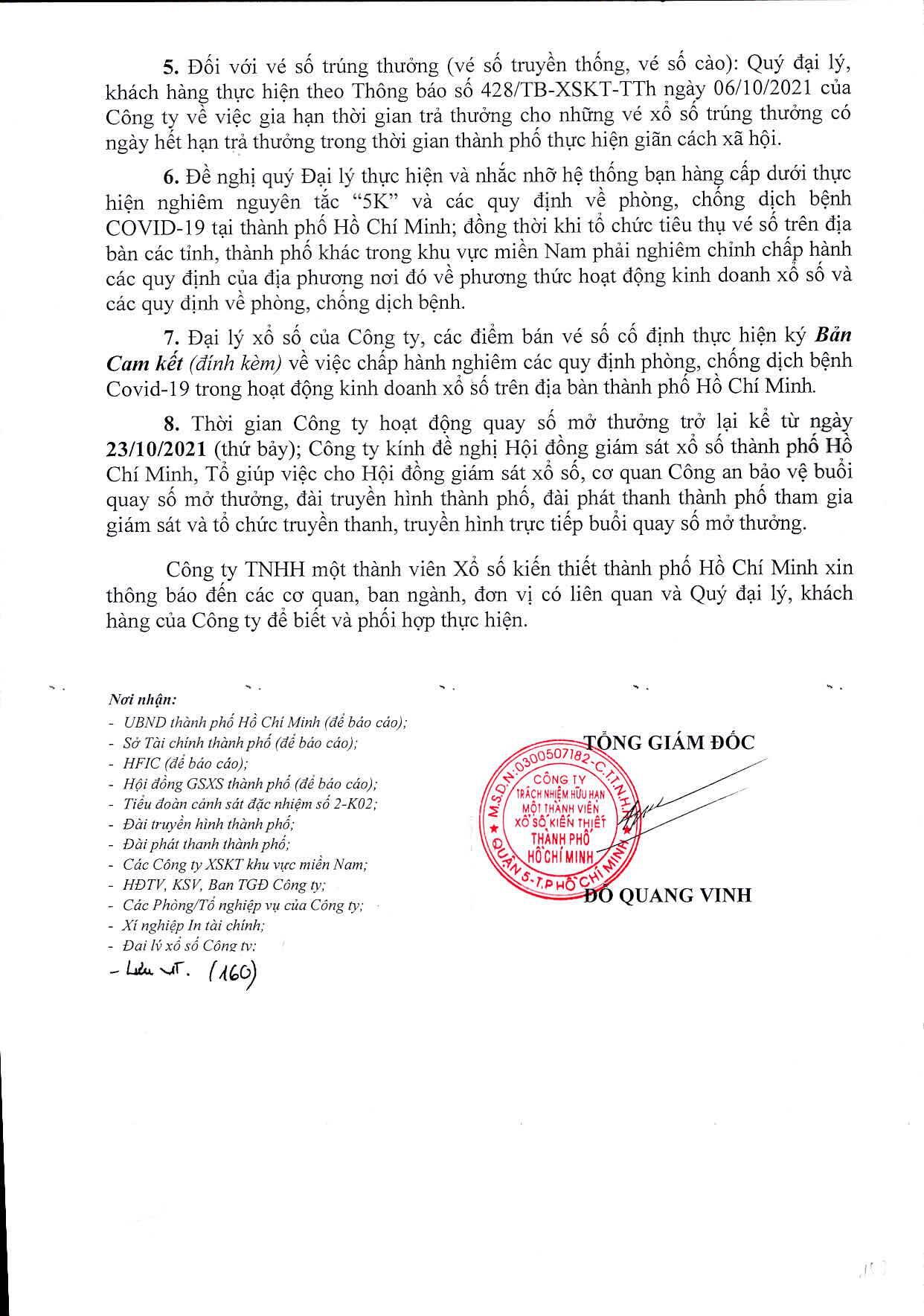 1. Từ ngày 22/10/2021, hoạt động kinh doanh xổ số trên địa bàn thành phố Hồ Chí Minh chỉ được thực hiện tại các điểm cố định, tạm dừng hoạt động bán vé số dạo (cho đến khi có thông báo mới).