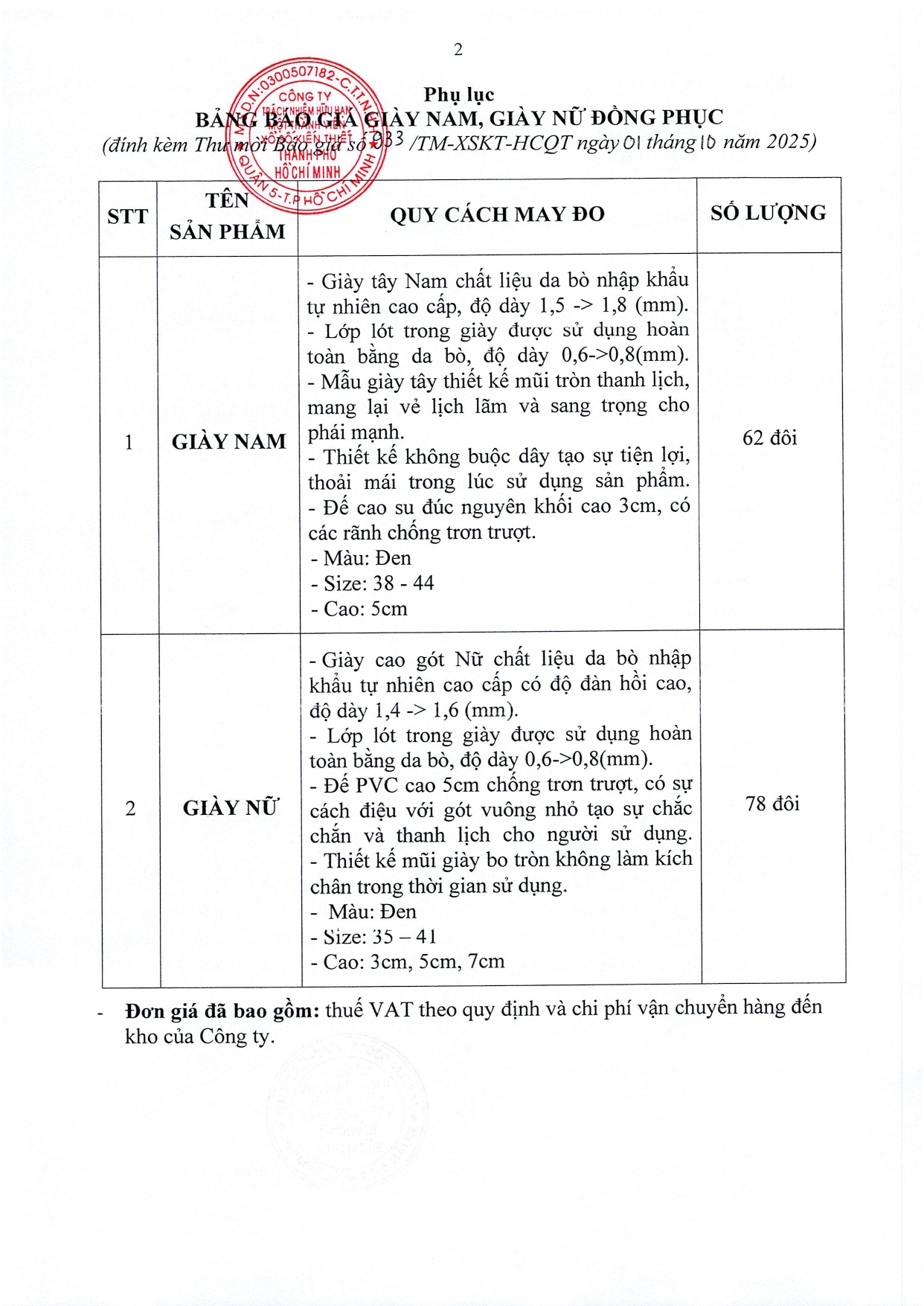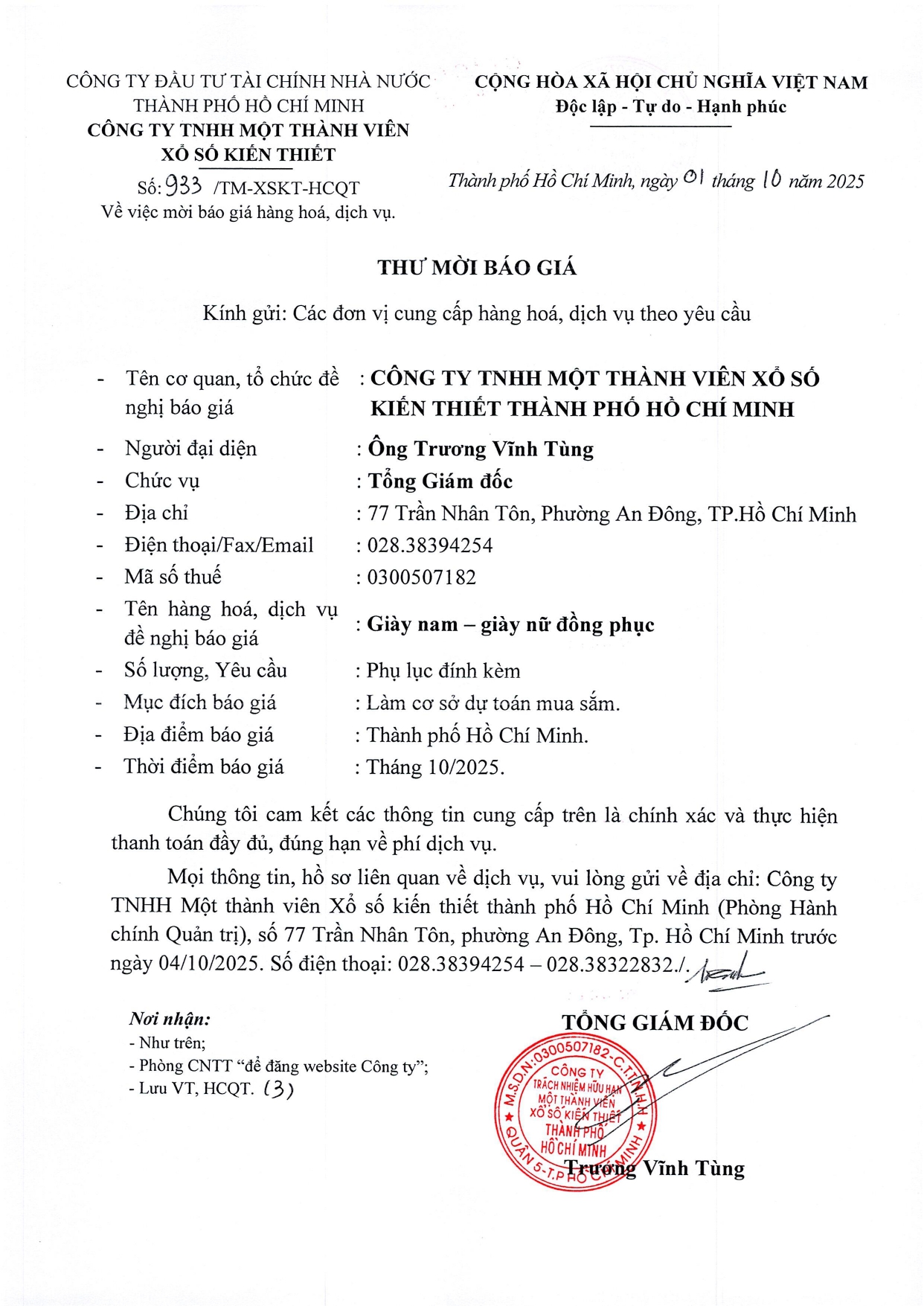 Thư mời báo giày nam - giày nữ đồng phục admin Zing Linkhay Twitter Google Facebook Yahoo Save Print Bài đăng khác Kết Quả Quay Số Mở Thưởng Ngày 06/12/2025 Kết Quả Quay Số Mở Thưởng Ngày 01/12/2025 Cán bộ, người lao động Công ty Xổ số kiến thiết Thành phố Hồ Chí Minh chung tay ủng hộ đồng bào miền Trung bị thiệt hại do bão lũ gây ra Tổ chức thực tập phương án chữa cháy, cứu nạn, cứu hộ năm 2025 Thư mời báo giá Bộ áo dài đồng phục ( gồm vải và công may, đo). Thư mời báo giá dich vụ tổ chức Chương trình Giao lưu thường niên cho Công đoàn