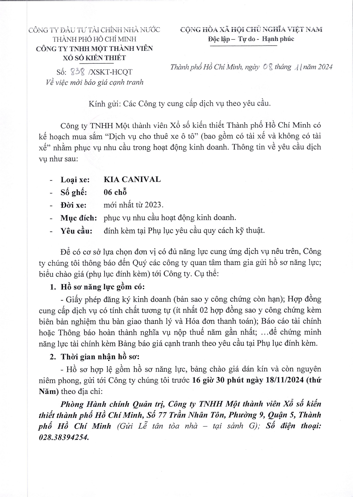 Thư mời chào giá cạnh tranh dịch vụ cho thuê xe Ô tô admin Zing Linkhay Twitter Google Facebook Yahoo Save Print Bài đăng khác Cán bộ, người lao động Công ty Xổ số kiến thiết Thành phố Hồ Chí Minh chung tay ủng hộ đồng bào miền Trung bị thiệt hại do bão lũ gây ra Thư mời báo giá bộ hộp cơm giữ nhiệt Thư mời báo giá gói dịch vụ trang trí Noel - Tết Dương lịch Thư mời chào giá cạnh tranh lịch tết xuân 2025 ( Lịch siêu cực đại ) Hội nghị tập huấn về ứng phó sự cố, bảo đảm an toàn thông tin mạng tại Công ty TNHH Một thành viên Xổ số kiến thiết Thành phố Hồ Chí Minh thành công tốt đẹp Công ty TNHH Một thành viên Xổ số kiến thiết Thành phố đã trao 400 suất hỗ trợ bệnh nhân mắc bệnh hiểm nghèo
