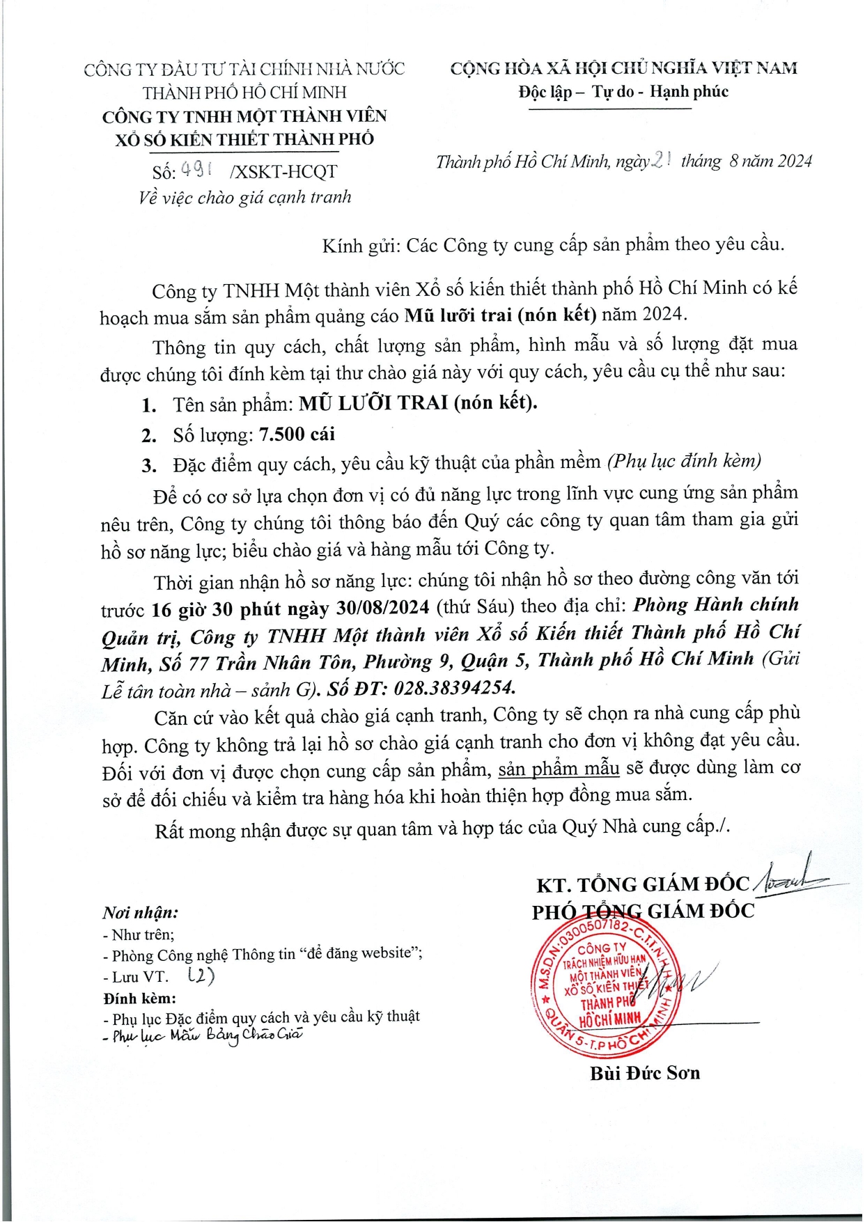 Thư mời chào giá cạnh tranh mũ lưỡi trai theo yêu cầu admin Zing Linkhay Twitter Google Facebook Yahoo Save Print Bài đăng khác Kết Quả Quay Số Mở Thưởng Ngày 06/12/2025 Kết Quả Quay Số Mở Thưởng Ngày 01/12/2025 Cán bộ, người lao động Công ty Xổ số kiến thiết Thành phố Hồ Chí Minh chung tay ủng hộ đồng bào miền Trung bị thiệt hại do bão lũ gây ra Thư mời chào giá cạnh tranh sổ dò theo yêu cầu Thông báo địa chỉ tên miền trang thông tin điện tử Công ty Thư mời chào giá cạnh tranh sản phẩm "Móc khóa cào"