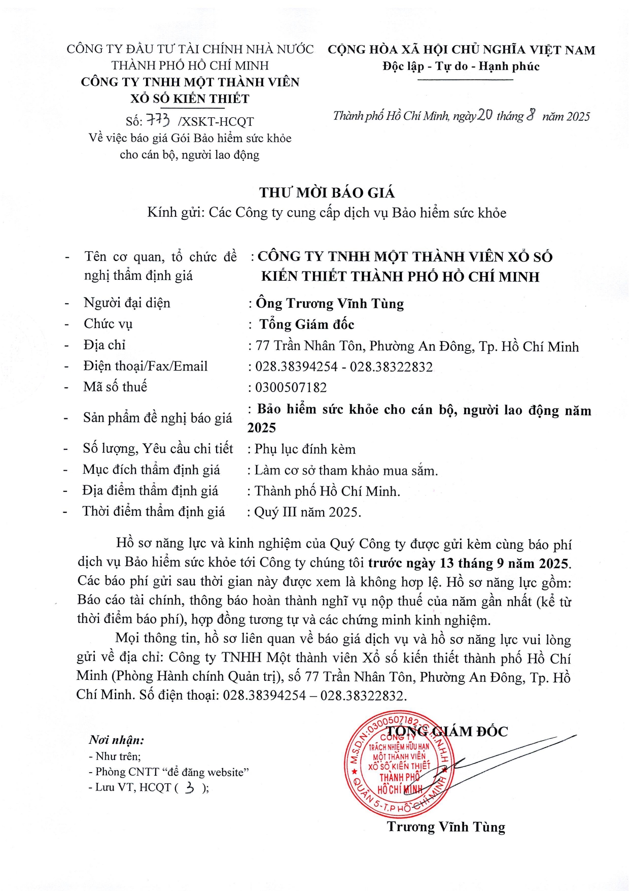 Thư mời chào giá gói cung cấp dịch vụ Bảo hiểm sức khỏe admin Zing Linkhay Twitter Google Facebook Yahoo Save Print Bài đăng khác Kết Quả Quay Số Mở Thưởng Ngày 06/12/2025 Kết Quả Quay Số Mở Thưởng Ngày 01/12/2025 Cán bộ, người lao động Công ty Xổ số kiến thiết Thành phố Hồ Chí Minh chung tay ủng hộ đồng bào miền Trung bị thiệt hại do bão lũ gây ra Công ty TNHH Một thành viên Xổ số kiến thiết TP Hồ Chí Minh tổ chức Hội nghị sơ kết hoạt động kinh doanh 6 tháng đầu năm 2025 Thư mời chào giá gói cung cấp và lắp đặt 08 thiết bị lưu trữ gắn ngoài MUA VÉ TỨ QUÝ 9999, CÔNG NHÂN TRÚNG ĐỘC ĐẮC 14 TỈ ĐỒNG XỔ SỐ THÀNH PHỐ HỒ CHÍ MINH