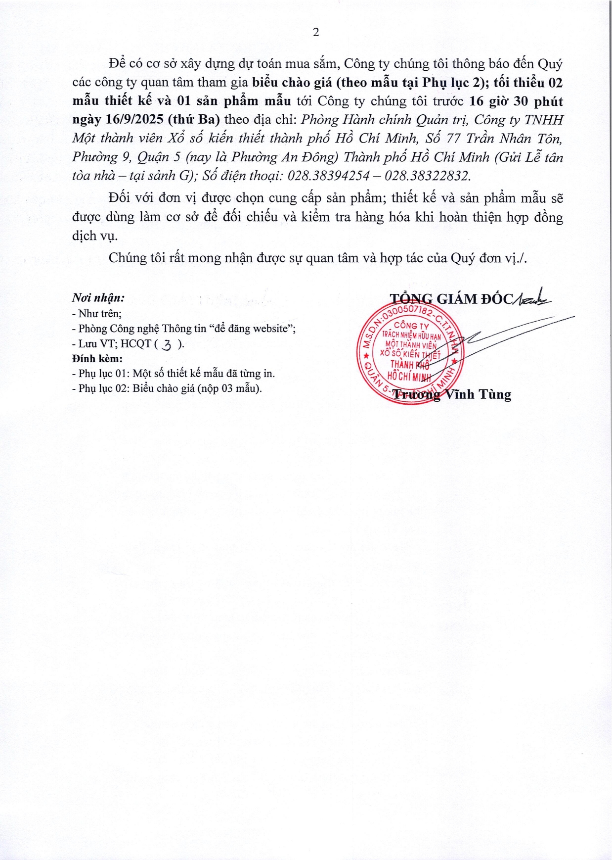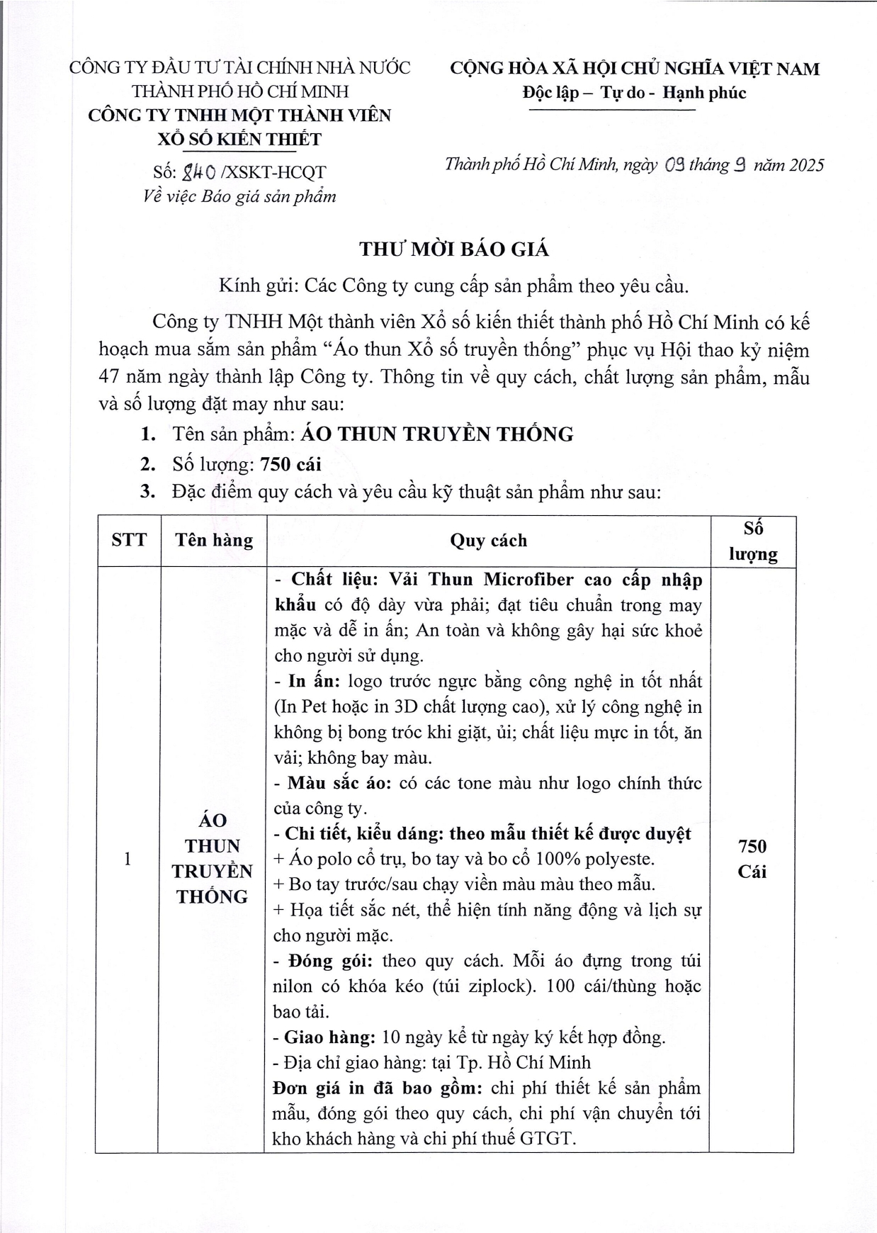 Thư mời chào giá sản phẩm áo thun truyền thống admin Zing Linkhay Twitter Google Facebook Yahoo Save Print Bài đăng khác Kết Quả Quay Số Mở Thưởng Ngày 06/12/2025 Kết Quả Quay Số Mở Thưởng Ngày 01/12/2025 Cán bộ, người lao động Công ty Xổ số kiến thiết Thành phố Hồ Chí Minh chung tay ủng hộ đồng bào miền Trung bị thiệt hại do bão lũ gây ra Thư mời chào giá sản phẩm xe đẩy hàng hóa theo yêu cầu Thư mời chào giá gói cung cấp dịch vụ Bảo hiểm sức khỏe Công ty TNHH Một thành viên Xổ số kiến thiết TP Hồ Chí Minh tổ chức Hội nghị sơ kết hoạt động kinh doanh 6 tháng đầu năm 2025