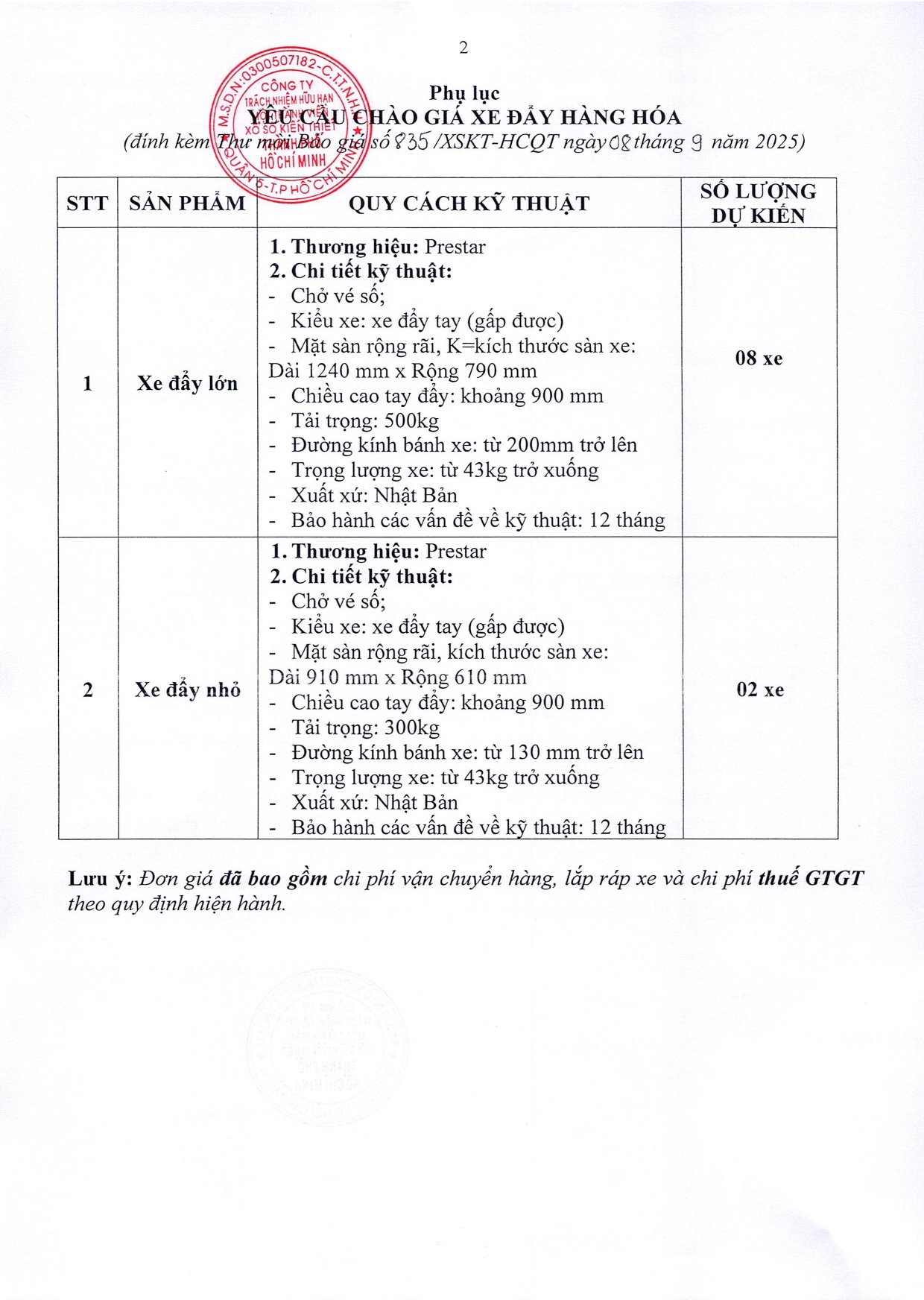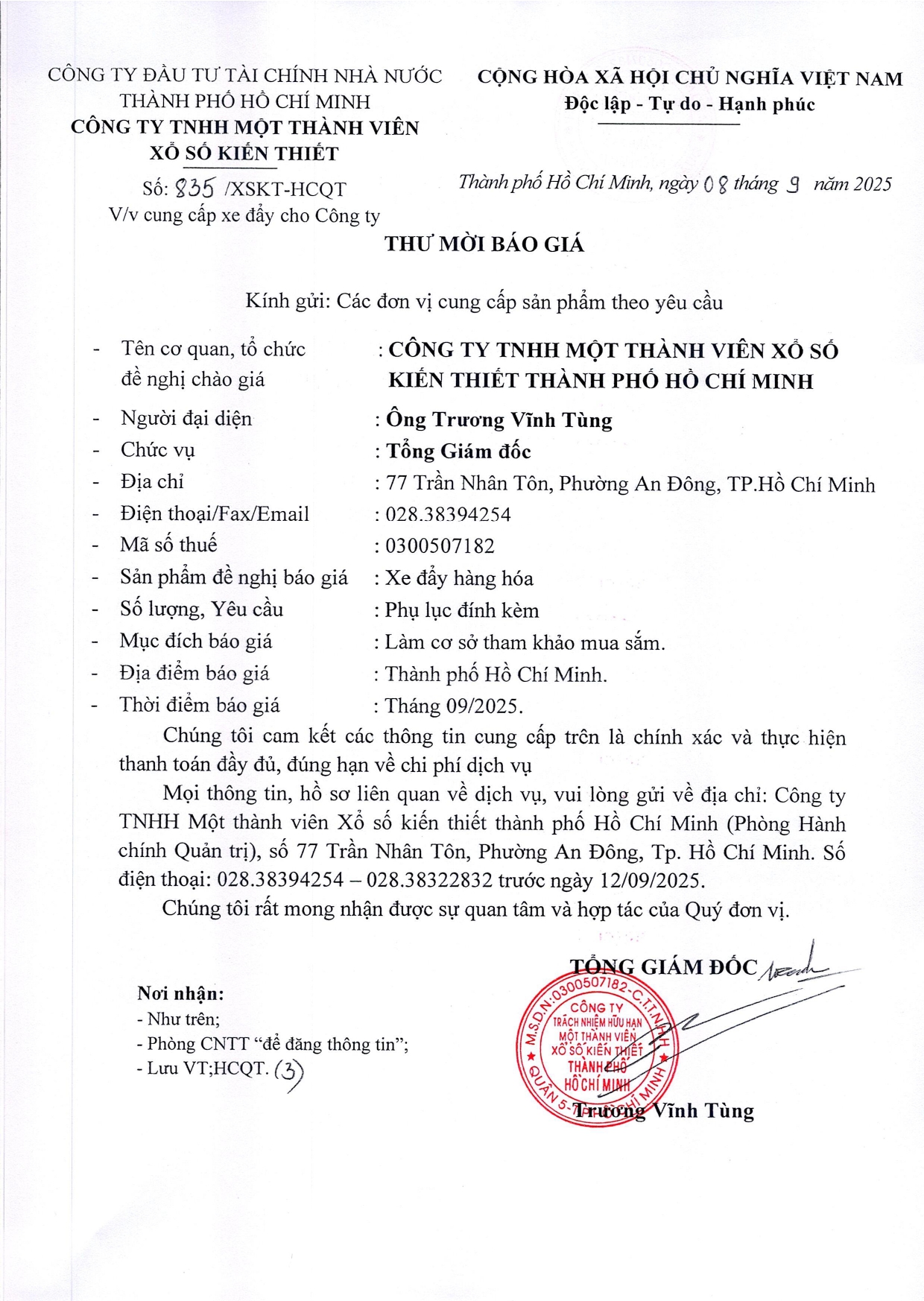 Thư mời chào giá sản phẩm xe đẩy hàng hóa theo yêu cầu admin Zing Linkhay Twitter Google Facebook Yahoo Save Print Bài đăng khác Kết Quả Quay Số Mở Thưởng Ngày 06/12/2025 Kết Quả Quay Số Mở Thưởng Ngày 01/12/2025 Cán bộ, người lao động Công ty Xổ số kiến thiết Thành phố Hồ Chí Minh chung tay ủng hộ đồng bào miền Trung bị thiệt hại do bão lũ gây ra Thư mời chào giá gói cung cấp dịch vụ Bảo hiểm sức khỏe Công ty TNHH Một thành viên Xổ số kiến thiết TP Hồ Chí Minh tổ chức Hội nghị sơ kết hoạt động kinh doanh 6 tháng đầu năm 2025 Thư mời chào giá gói cung cấp và lắp đặt 08 thiết bị lưu trữ gắn ngoài